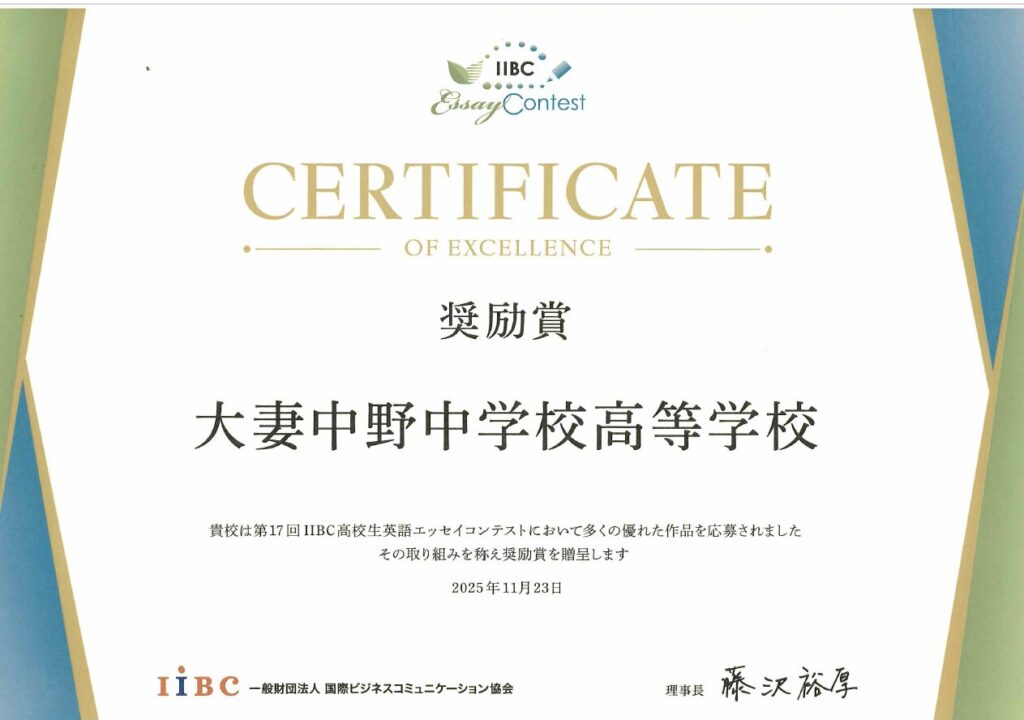 本校は、2025年度第17回IIBC高校生英語エッセイコンテストにおいて、6年連続となる「奨励賞」を受賞しました。