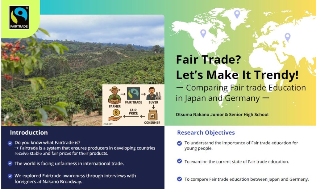 今年度、全国フォーラムに出場した本校代表チームは、「フェアトレードにおける日本の課題」をテーマに設定。国際比較データやフィールドワークを通して、個人の意識に依存しがちな日本の消費行動の背景にある制度・教育・社会構造に着目し、フェアトレードを「特別な選択」から「当たり前の選択」へと転換するための提案を、英語で発信しました。