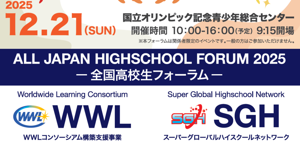 文部科学省WWL(ワールド・ワイド・ラーニング)コンソーシアム構築支援事業およびSGHの成果を共有する全国高校生フォーラム2025が、12月21日に開催され、本校の高校2年生の代表チームが参加しました。 今年は、このフォーラム開始から10周年。 本校は2018年以降7回目の出場となり、継続的にグローバル探究教育の成果を発信する学校として参加を続けています。 (以下、文科省のHPから本校のWWLの取り組みの紹介) https://www.mext.go.jp/a_menu/shotou/kaikaku/mext_00094.html