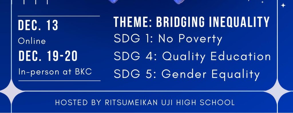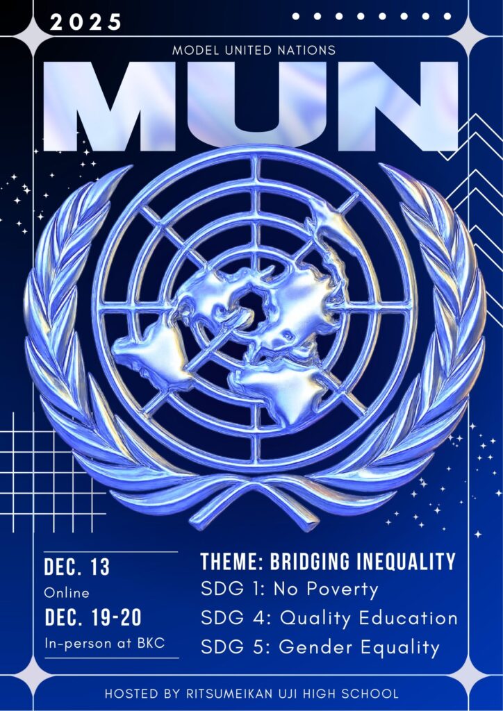 本校は、オンライン開催が主流であった時期から数えて、6年連続で立命館宇治模擬国連に参加しています。今回の議題は「Bridging Inequality(不平等の是正)」。 SDGsの中でも特に重要な、SDG1「貧困をなくそう」、SDG4「質の高い教育をみんなに」、SDG5「ジェンダー平等を実現しよう」を柱に、すべて英語で議論が行われました。