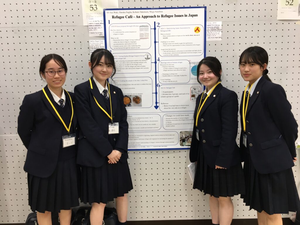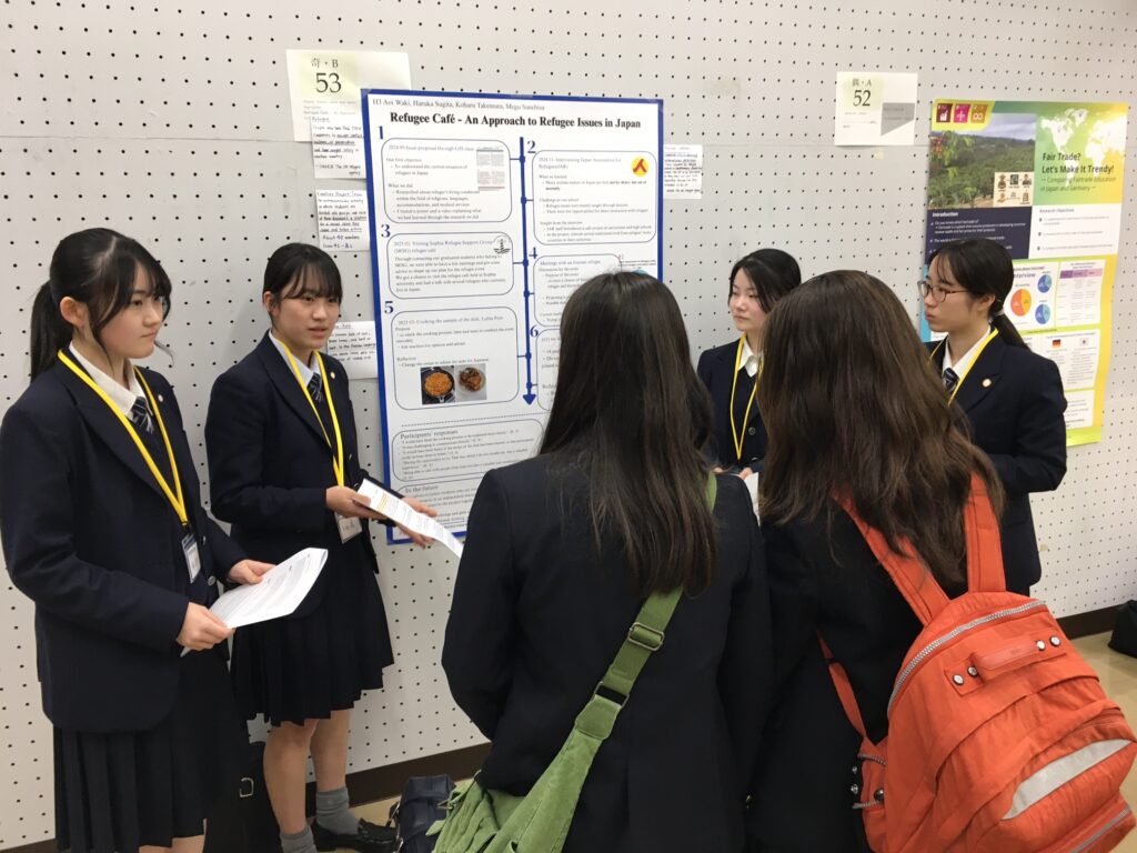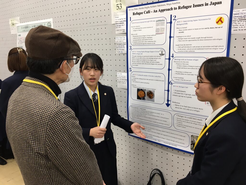 ポスターセッションでは、昨年度の探究活動を発展させて実施した「難民カフェ」の取り組みと研究成果を発表しました。 対話形式のポスター発表は初めてでしたが、発表者と聴衆の距離が近く、関心や反応を直接感じながら議論を深めることができました。 また、他校の研究では、日常の疑問から独自の問いを立て、多角的な視点で検証を進めている点が印象的で、とても学ぶところが多かったと思います。 研究には柔軟な思考と粘り強い探究が重要であることを実感し、今後も身近な疑問や好奇心を大切にしながら研究を深めていきたいと考えています。