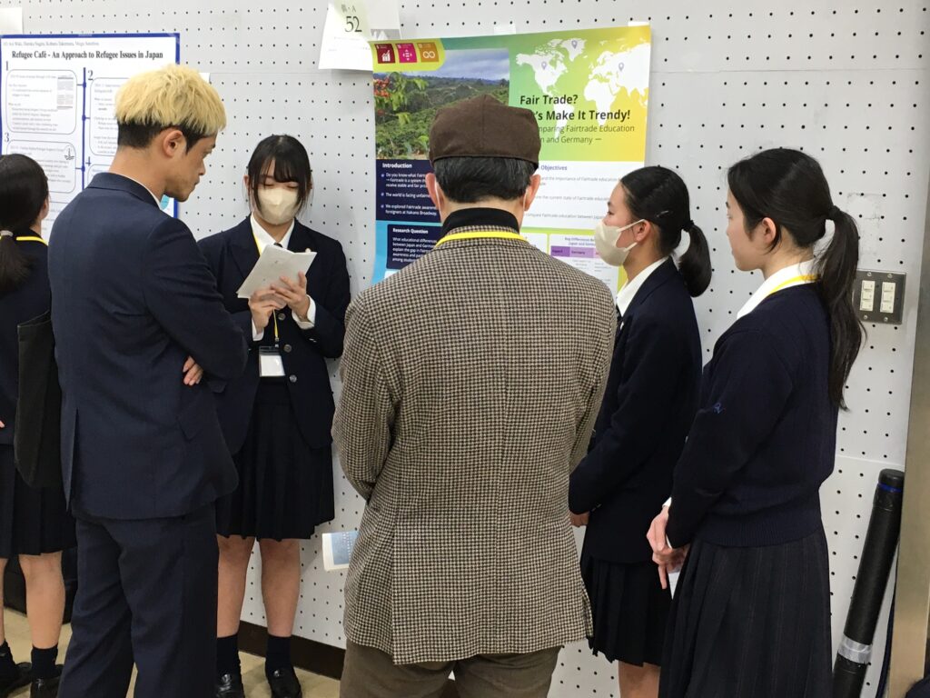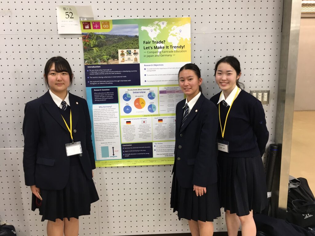 この発表では、フェアトレードを消費者の視点から分析し、改善策を提案しましたが、講評で「生産者の視点」を取り入れる重要性を指摘されたことが大きな学びとなりました。 課題を一方向からではなく複数の立場から捉えることで、より現実的で持続可能な提案につながることを実感しました。 また、他校の研究では、得られた知見を社会的実践へと結びつけている事例が多く、探究が社会を理解し変える力を持つことを学びました。今後は、多角的な分析と実践的な検証を意識した探究へ発展させていきたいと思います。