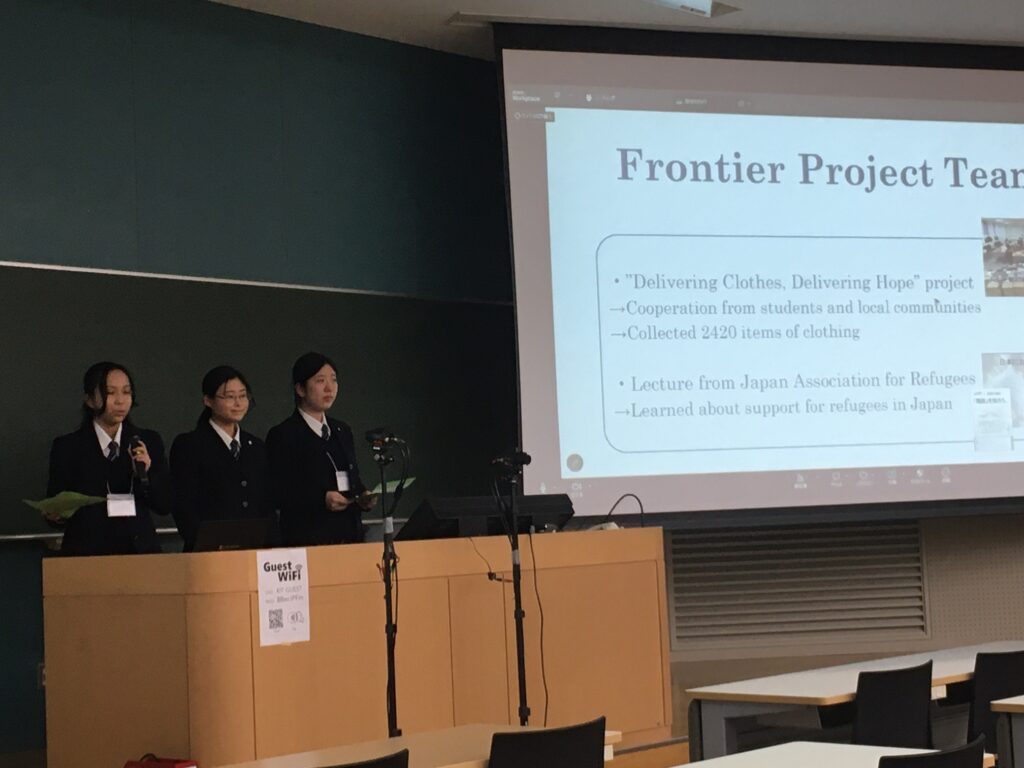 本校のWWL連携校である大阪の清教学園中学校・高等学校からは、4名の高校1年生が “How Can the Middle-Income Trap Be Overcome?: Exploring Africa’s Future through Social Welfare” というテーマで探究成果を発表しました。アフリカ諸国の経済発展と社会福祉の関係に着目し、中所得国の停滞という国際経済上の課題を多角的に分析した内容で、英語による論理的な展開が印象的でした。