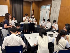 各グループに、大妻中野中学校・高等学校の生徒、東京都立山崎高等学校の生徒、玉川大学教育学部の学生が入り、高大連携の混成グループを結成し、テーマに関する議論と同時に、各グループ内で学校間交流を進め、連帯意識を醸成することができました。