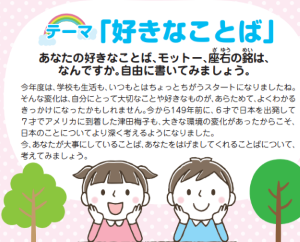 このコンテストでの津田塾大学のメッセージは、「今から149年前に、6才で日本を出発して7才でアメリカに到着した津田梅子も、大きな環境の変化があったからこそ、日本のことについてより深く考えるようになりました。今、あなたが大事にしていることば、あなたをはげましてくれることばについて、考えてみましょう。」です。