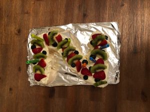 そして、別の日にはホストマザーのお母さんのお誕生日をお祝いしました。オーストラリアではお誕生日の時にケーキとは別にパブロバという卵白でできたとても甘いものを食べます。ケーキではありませんが見た目はケーキに近いです。卵白でできた生地に生クリームをのせその上にブルーベリー、キウイ、イチゴをのせます。これがそのパブロバです。頭文字がNなので、Nの形をしています。