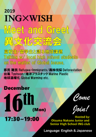ING同好会では12月16日(月)に大妻中野の近所に立地する早稲田大学国際寮(WISH)を訪問し、留学生の方々と交流会を行いました。WISHとING同好会は、秋は大妻中野の文化祭で、冬はWISHにて、英語と日本語を交えながら異文化交流を続けています。今回のテーマは”高校生・留学生と語る地球課題”。5チームが「移民・難民」「森林伐採」「台風」「海洋プラスチック」「地球温暖化」からテーマを一つ選び、チームで議論したことを全体会議で発表しました。今回の交流会では、企画立案、資料作成、司会進行をING同好会が担当させて頂いたのですが、参加した大学生の皆様が優しくサポートして下さり交流会は大成功でした。これからも”楽しい&発見や学びがある”交流会を続けていきたいです。