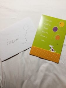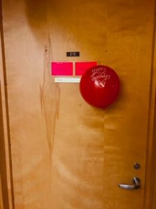 What’s more, back to my dormitory, it was my birthday that day, so I had a birthday balloon in front of my room and had a message card.” Of course, as the day was Halloween, I received a lot of candy.
