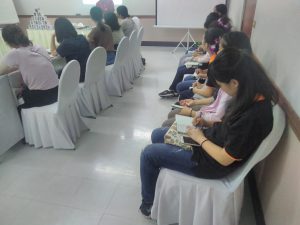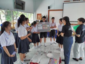 それぞれのアクティビティは全てサンパトーンウィタヤコムスクールの生徒が教えてくれます。最後は今日1日の活動をgraphic reviewとして模造紙にまとめ、各グループで発表をしましたが、片言ながらもタイ語・日本語・英語を織り交ぜながら一生懸命コミュニケーションを図り、お互いの表現を共有しようとしていました。