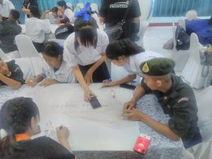 それぞれのアクティビティは全てサンパトーンウィタヤコムスクールの生徒が教えてくれます。最後は今日1日の活動をgraphic reviewとして模造紙にまとめ、各グループで発表をしましたが、片言ながらもタイ語・日本語・英語を織り交ぜながら一生懸命コミュニケーションを図り、お互いの表現を共有しようとしていました。