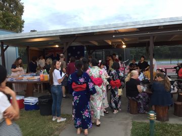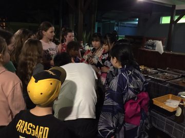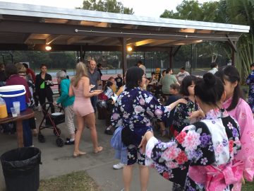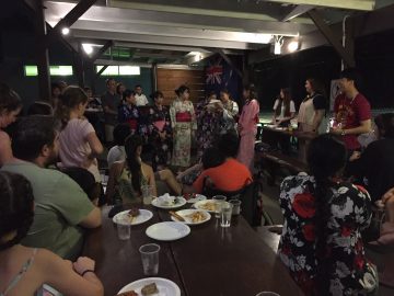 8月9日(金)SACC最後のディナーは、ホストファミリーをご招待してのBBQパーティです。ハンバーグ、ソーセージ、カンガルーのお肉などをパンに挟んで頂きます。事前の行った浴衣の着付け講習の甲斐あって、みんな浴衣を素敵に着こなしていました。