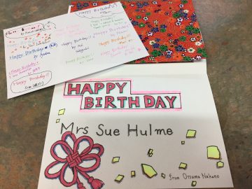今日はSACCセミナーのお世話役をして下さっているMrs. Hulmeのお誕生、皆で感謝の気持ちを込めて手作りのカードをプレゼントしました。