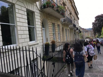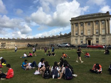 今日はこのさわやかな青空のもとで、Bathのcityまで遠足です。グループで先生の引率のもと、Bathの歴史的な建造物を見て回りながら、最終目的地の The Abbey と The Roman Baths に向かいます。途中の Royal Crescent と Victoria Parkで休憩とスケッチ。 Royal Crescent は、1770年代に建築された王族などのための滞在場所です。一面の芝生のVictoria Parkを望む三日月形のデザインに圧倒されます。