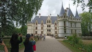 3時まで授業をした後、近くにあるアゼルリドー城(Azay – le – Rideau)に行きました。このお城もフランソワ1世にゆかりのあるお城です。窓の枠が十字架になっていることと、屋根の先がとがっていて装飾も細かいことからロマネスク様式のお城だと見分けることができるとの説明を受けました。窓の枠の十字架、お分かりになりますか?その他、タピスリーといわれる縦断が壁にかけられているのには、寒さ対策・インテリアとして・プライベートな空間を大切にするためだそうです。天蓋付きベットも寒さ対策・プライベートな空間保持というのは理由としてすぐわかりましたが、天井からの虫対策という理由でベットの天井が覆われていたというのにはびっくり!その他、お城での生活あるあるを教えていただきながら、楽しく見学できました。