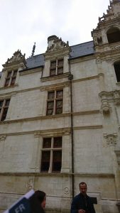 3時まで授業をした後、近くにあるアゼルリドー城(Azay – le – Rideau)に行きました。このお城もフランソワ1世にゆかりのあるお城です。窓の枠が十字架になっていることと、屋根の先がとがっていて装飾も細かいことからロマネスク様式のお城だと見分けることができるとの説明を受けました。窓の枠の十字架、お分かりになりますか?その他、タピスリーといわれる縦断が壁にかけられているのには、寒さ対策・インテリアとして・プライベートな空間を大切にするためだそうです。天蓋付きベットも寒さ対策・プライベートな空間保持というのは理由としてすぐわかりましたが、天井からの虫対策という理由でベットの天井が覆われていたというのにはびっくり!その他、お城での生活あるあるを教えていただきながら、楽しく見学できました。