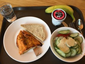 今日のダイニング・ホールとランチ(例です)。プログラムも前半終了。イギリスの生活にもだいぶ慣れてきて、皆、元気です。