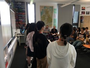 英語の授業の様子をレポートします。世界各国からの生徒が一緒になって、英語力を基準にクラスがわかれます。ただどのクラスも、グループでのリサーチ、ディスカッション、それをまとめてのプレゼンテーション、そして、インタラクション(先生やオーディエンスの生徒からの質問を受けてのやり取り)というPBL(プロジェクト型の授業)です。スペイン、ポルトガル、イタリア、中国、韓国、ベトナム、日本とそれぞれの音の英語があります。ここでは、英語の発音に「よい」も「悪い」もありません。delivery (言いたいことを伝えているか)がポイントです。