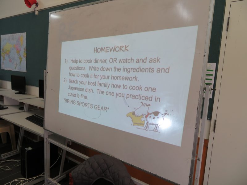 明日の宿題は料理の仕方をホストファミリーに聞いて、作り方を聞いてくること。また、自分たちも何か日本の料理の仕方を伝授してくることです。どんなお料理を習ってくるのでしょうか。一緒にホストファミリーとお料理できるといいですね。
