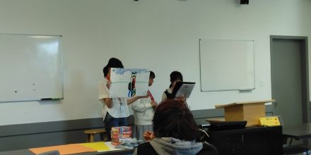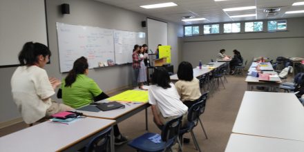 英語コースは、自分達の考えたカナダ国旗について、フランス語コースは、セミナーでの思い出について、英語でプレゼンテーション。