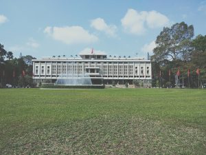 ここはホーチミン市の統一会堂、元南ベトナム大統領府です。1975年4月30日、北ベトナム軍の戦車がここに突っ込み、長かったベトナム戦争が終わりました。