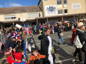 ラクレットをした翌週の火曜日に carnaval とよばれる小さなフェスがありました。このフェスはサンドニ系列の小学校も参加します。とても小規模なcarnavalです。両方の学校共に午後の4コマ目と5コマ目の時間をcarnavalに変更し、生徒や先生が仮装しみんなでお祭りのように盛り上がるというものです。私は前の週末にホストマザーと共にリリのcarnavalの衣装を作りました。リリの学年は自分たちで手を加えなくてはいけないというルールがあったためです。リリは羊を模した衣装を身に纏いました。ウェンディは蜂の衣装、アリスはパンダでした。FLEの生徒は特に仮装などはしなかったのですが、先生が可愛い洋服を着て全校生徒が衣装を披露し終わった際にFLE!!!と呼ばれFLEの生徒たちはみんなノリノリで会場の真ん中ではしゃぎました。とても楽しかったです。本日の写真にcarnavalの様子がわかるものを添付しておきます。