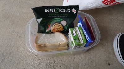 サンドイッチ、フルーツ(ジュース)、スナック菓子。
