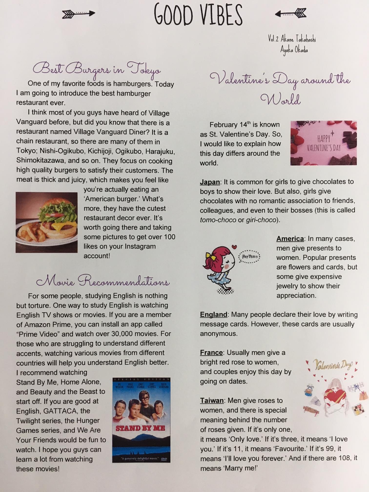 Otsuma Nakano Global Leaders Class students are always committed to independent works in and outside school. One of their such kind of activities are to produce independent paper magazine. Ayaka Okada and Akane Takahashi, from junior students of GLC of Otsuma Nakano, are now introducing their paper called “Good Vibes.” Its contents are “Best Burgers in Tokyo,” “Valentine’s Day around the World,” and ” Movie Recommendation”, which looks so intriguing, informative and stylish. I hope you enjoy reading their great work.