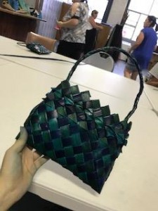 I went to Waitara to make a traditional Maori bag. Karen, a flax weaving teacher, harvests (picks/cuts) the flax (Harakeke) and dyes it. At the class she showed me how to weave it and helped me to make a traditional Maori bag called a Konae. Konae is similar to a Kete, which is a bigger bag. Konae has two corners but Kete has four corners and more like the bottom of a box.