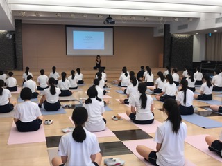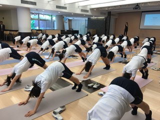 いつもは机と椅子が整然と並ぶCosmosアゴラにヨガマットを敷き並べ、