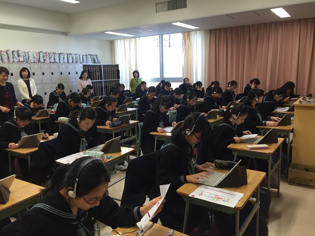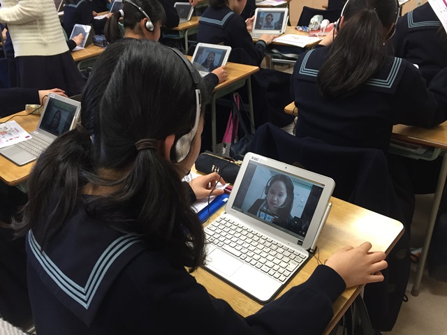 今日は手始めに、中学1年生の教室で15分間のオンライン英会話レッスンの