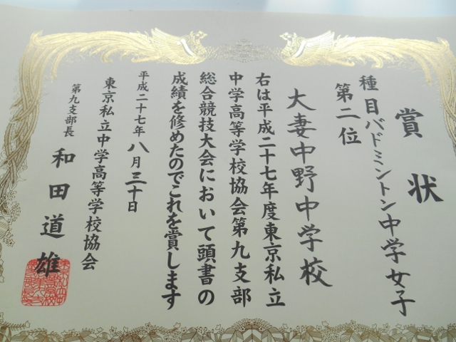 2015.09.21 お知らせ中学バドミントン部第9支部大会準優勝!顧問生活10年、初めての入賞。この結果は率直に嬉しいです!バドミントン部顧問のU先生が満面の笑顔で眺めている9支部大会準優勝の賞状。 未経験者ばかりの中学バドミントン部で、2年半、とにかく努力してきた3年生が中心になって獲得した成果です。 競技の特性上、空調が使えない体育館で夏の蒸し暑さや冬の底冷えに耐えながら、みんなで頑張ってきたバドミントン部員たち。全員未経験。ゼロからのスタートでも、努力は人を裏切らない。この実感が、また新たな努力へとバドミントン部を駆り立ててくれることでしょう!