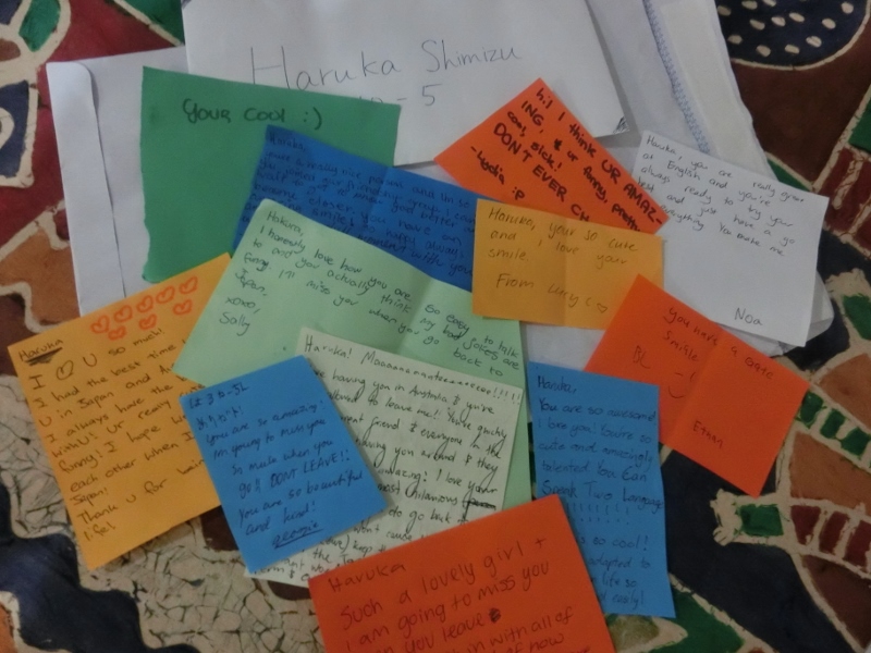 写真の手紙は、みんなからretreatでもらったものです。三年後の自分への手紙と、友達や先生にメッセージをかく時間がありました。予想以上にメッセージをもらい、嬉しかったです。