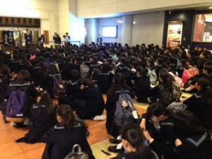 2015.05.13 お知らせ中学3年生 平和学習旅行 その1天候が心配された出発日でしたが、朝から見事な快晴。時間通り全員が無事、羽田空港に集まることができました。添乗員さんのお話を聴く顔も、天気に負けないくらい晴れやかです。これから、福岡空港に向けて出発します。