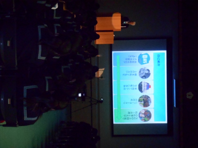 She gave her lecture to 3rd and 4th grade students in the gymnasium, and the lecture was simultaneously broadcast through U-Stream to each classroom of the rest of grades.