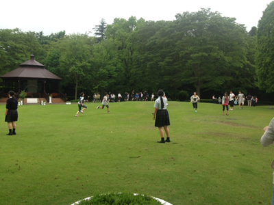 2014.06.13 お知らせ高校1年 ENGLISH CAMP No.6雨上がりの晴れ間に、ホテルの前庭で、ネイティブの先生たちと屋外のアクティビティを楽しみました。 “Freeze!” “Melt!” 英語を身体で覚えます。