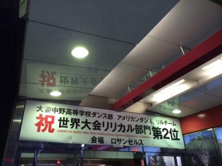 2014.05.21 お知らせ感謝!ダンス部を祝う中野ブロードウェー 早稲田通り口JR中野駅への通勤通学路。大妻中野高等学校ダンス部の世界大会での活躍をお祝いしてくれる広告が掲げられています。中野全体でお祝いしてくれる!感謝です。