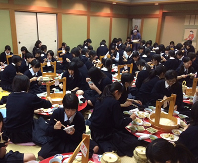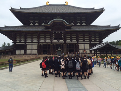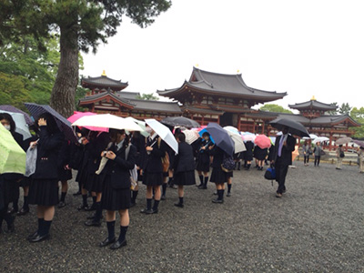 2014.05.15 お知らせ高校2年生 歴史文化研究旅行 その3三日目で奈良とはお別れです。 午前は興福寺、東大寺を周りました。興福寺では国宝館にて、英語で勉強したばかりの阿修羅像に興味津々。東大寺では鹿の大群に戸惑いながら、大仏殿に感動していました。 二月堂、三月堂を観た後、食事はお座敷でそうめんと柿の葉寿司をおいしくいただきました。 午後は京都に入り、平等院と清水寺へ。あいにくの雨の中、奈良とはまた異なる、華やかな寺の雰囲気を満喫しました。