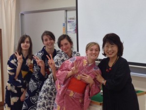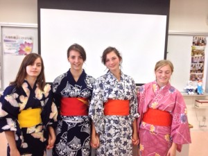 2013.10.31 お知らせフランスからの留学生とファッション・ショー 今日の6限です。高校1年6組の家庭総合の授業で、ファッション・ショーを行いました。 生徒たちは、自作のスカートやパンツに上着を合わせ、みんなの前で披露しました。フランスからの留学生4人も浴衣を着付けし、皆といっしょに楽しい時間を共有しました。