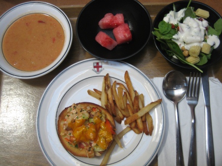 ランチは、ベーグルとスープです。ベーグルの上のソースには野菜もたっぷり入っていてとても美味しかったです。