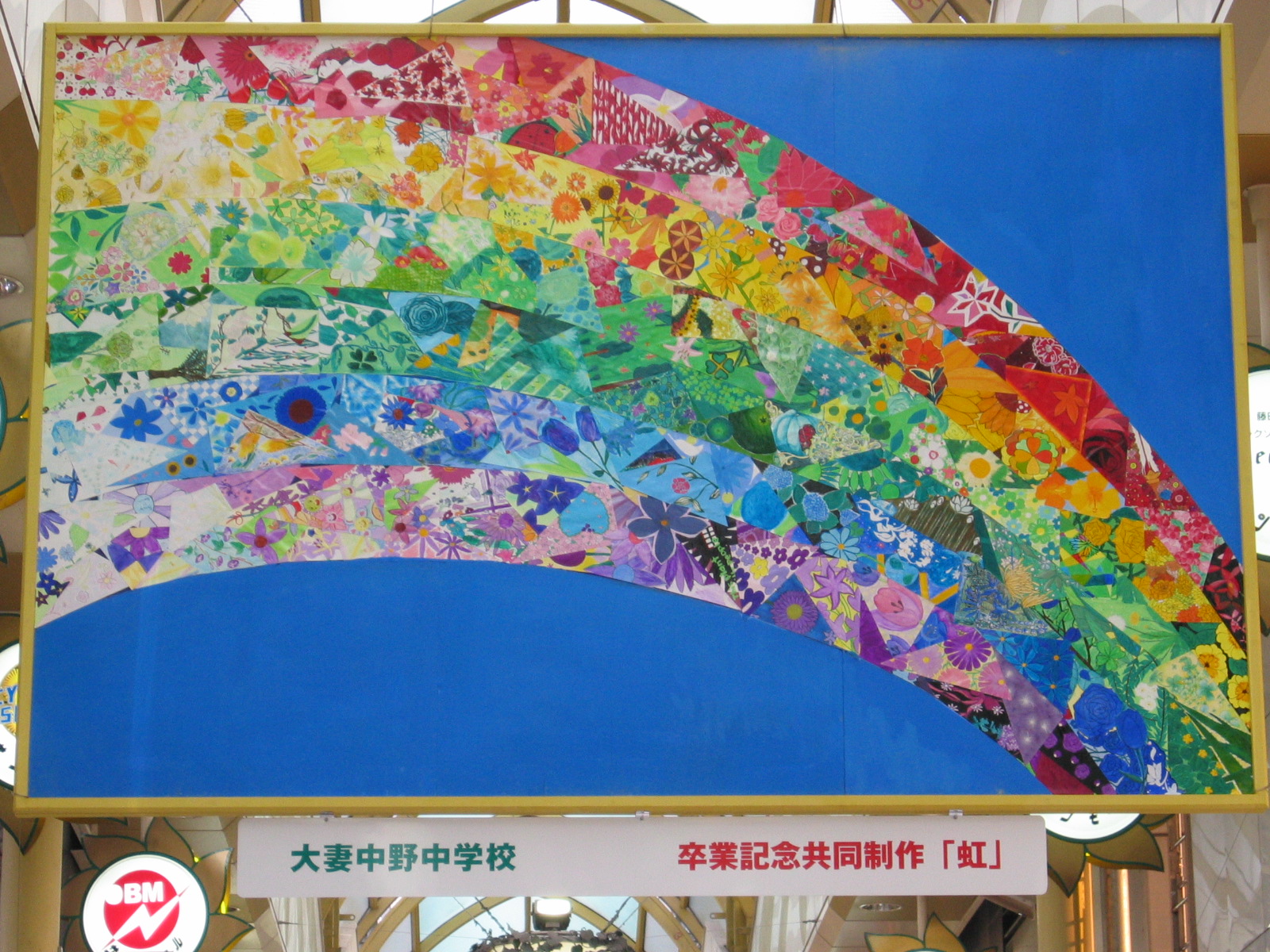 2008.05.28 お知らせサンモール空中ギャラリー参加作品サンモール空中ギャラリー参加作品中学3年生(現高校1年生)が卒業記念として美術の時間に共同制作した作品「虹」です。JR中野駅北口のサンモールに掲示されました。大きさは180cm×360cmの大きな作品です。
