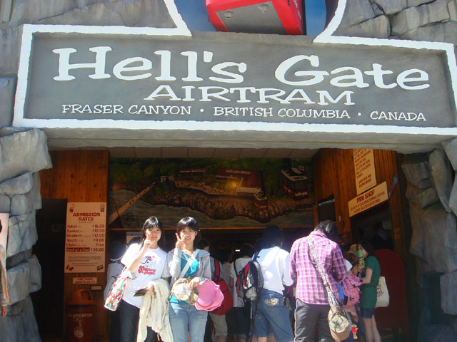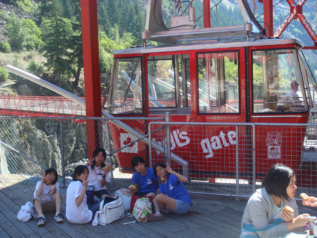 次に訪れたのがHell’sGate、地獄の入り口。バンクバーまでのびるフレイザー川はとても長いのですが色々な表情があります。今日行ったヘルズ・ゲイトは100mほど幅がある川が細くなり15mほどになったところの谷底です。ゴンドラに乗って下まで降りて、激しい川の流れを見ながらランチタイム。谷底にある川の流れはとても速くて、もしも地獄があるならばここが入り口なのかも?と思わせるほどの力強い流れでした。この川を毎年鮭が上ってくるそうです。