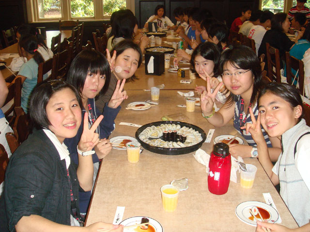 こっちにきて6日目、ちょうど日本食が恋しくなってきた本日の晩ご飯はお寿司でした。久しぶりの日本米に、海苔に、醤油にみんな大興奮。お寿司の内容はサーモン巻き、カリフォルニアロールとさつまいも巻き。サーモン巻きが一番人気、そしてカリフォルニアロール、さつまいもは甘くて不思議な味がしました。現地のスタッフはさつまいも巻き「It’s delicous!」と食べていましたが生徒は首をかしげるばかり。日本のお寿司もカナディアンテイストでした。
