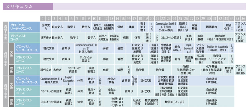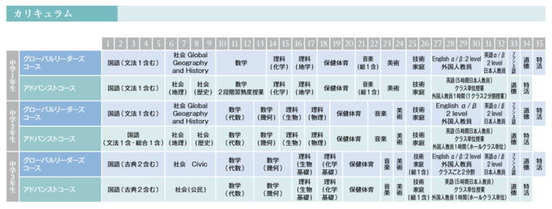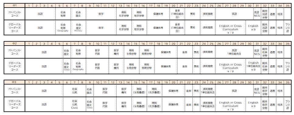 中学段階では、探究的な学びの基礎となる「知識・技能」の十分な体得を目指し、国語、数学、英語に十分な教科時間を配置しています。また、教科で学んだ知識、技能を活かし、自ら課題設定を行い、より深くリサーチを進め、その課題解決を考えていく「探究」を、中学1年では国語、中学2年では社会、中学3年では数学に、「探究」に時間を設定し、カリキュラムポリシーの実現を目指します。また、グロ―バル・リーダーズ・コースでは、クロスカリキュラム(様々なトピックを英語で学ぶ)の手法で、より探究的な英語、フランス語授業を始め、各教科ともにプロジェクトベースの学習となります。