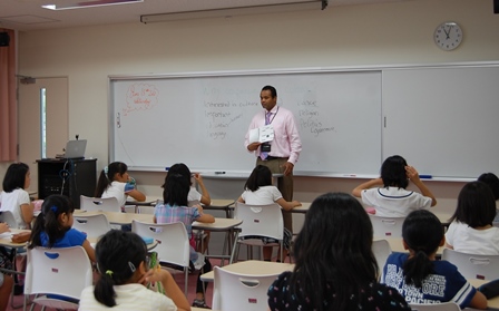本校は、帰国生が持っている高い英語力をさらに伸ばし、英語をアドバンテージとして、将来活躍できることを目指した教育を長年にわたり行ってきました。 そのノウハウを活かし、 本校では、2006年度より、帰国子女の小学生及び英語力の高い小学生を対象にした英語力保持・伸長のための講座を無料で毎週土曜日に実施しています。 本校アメリカ人専任教諭が担当する取り組みで、北米の小学校授業スタイルで行われています。