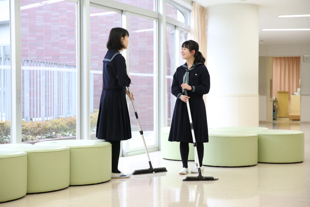 キレイな校舎は生徒の努力で保たれています。みんなで協力し合い、素早くしっかりすみずみまで清掃する時間です。